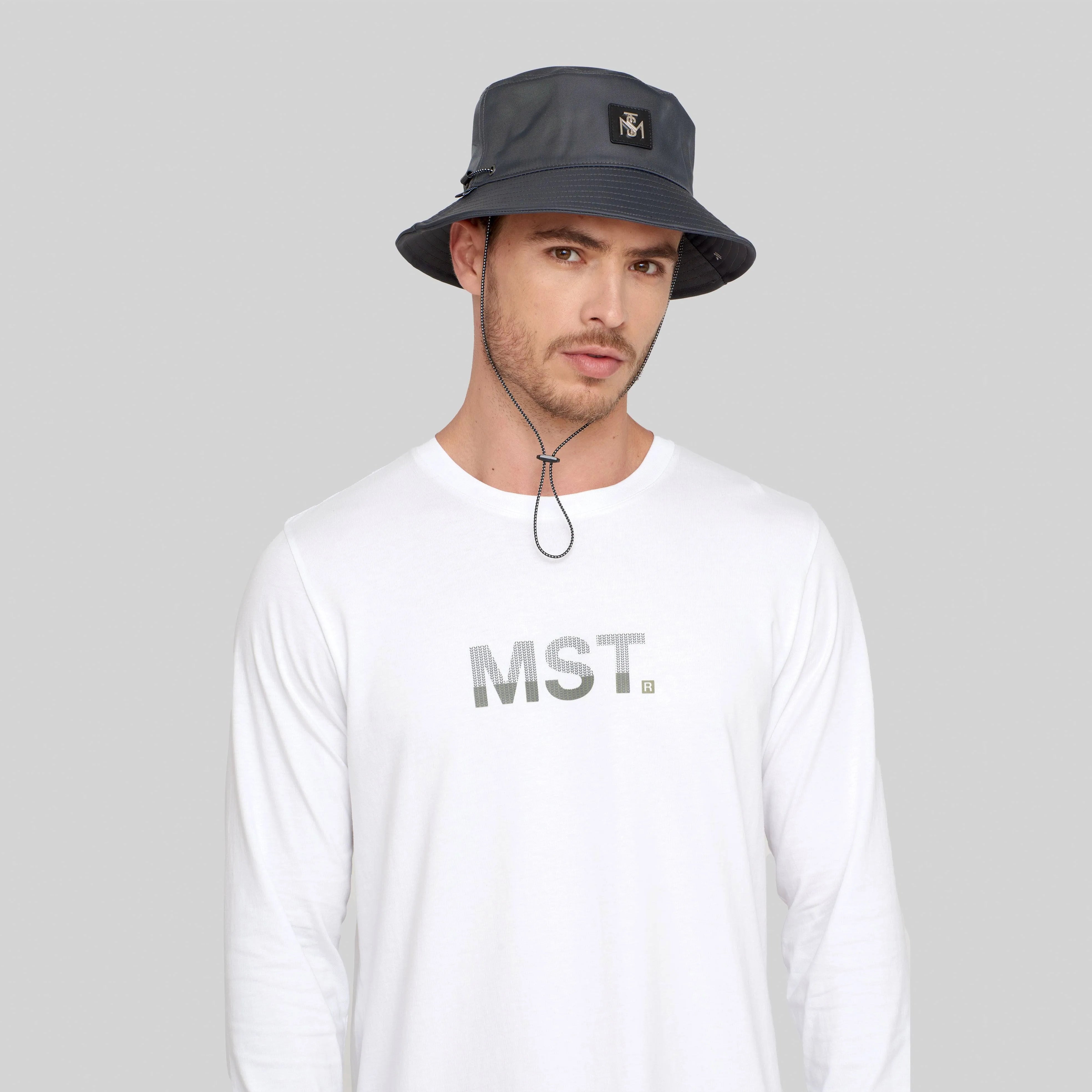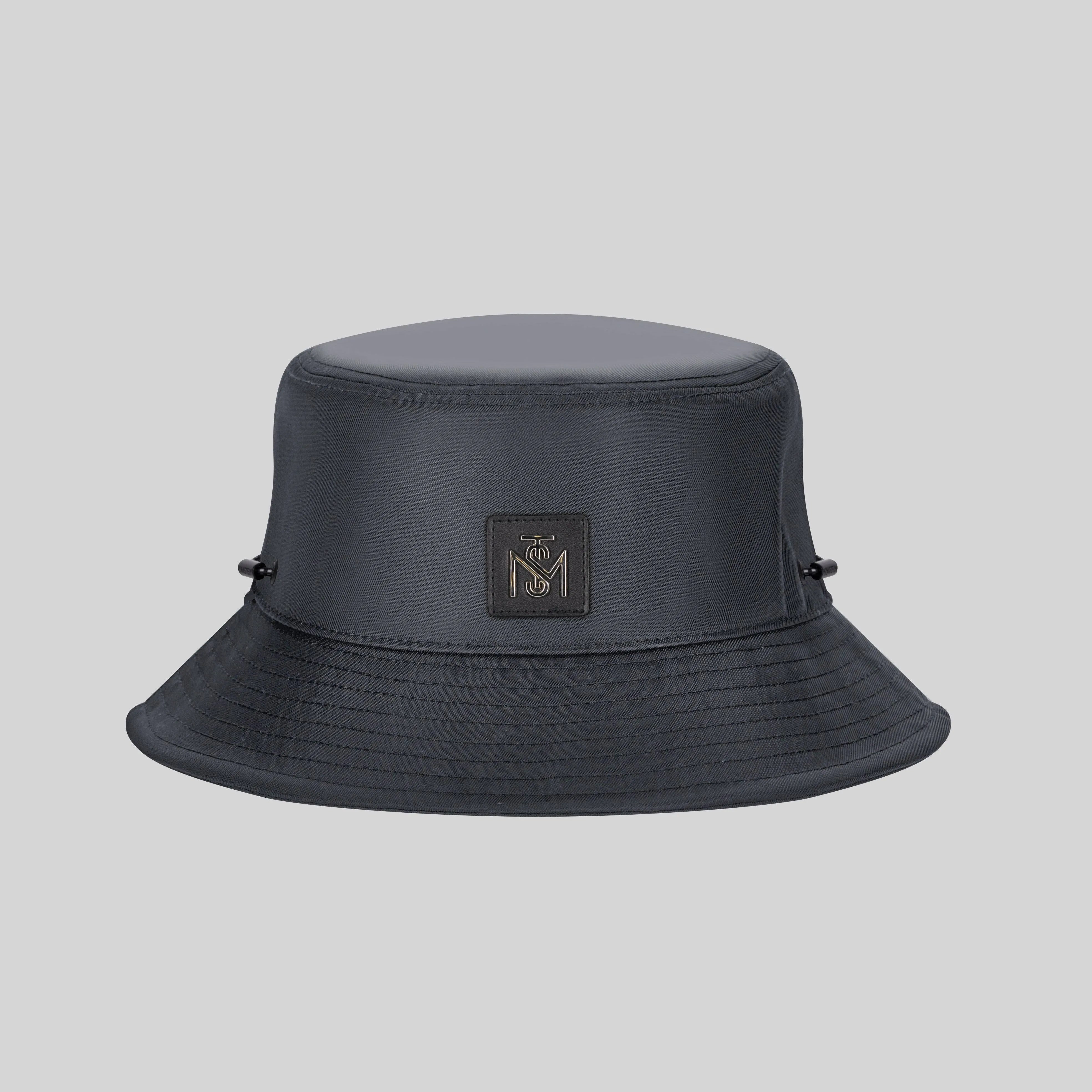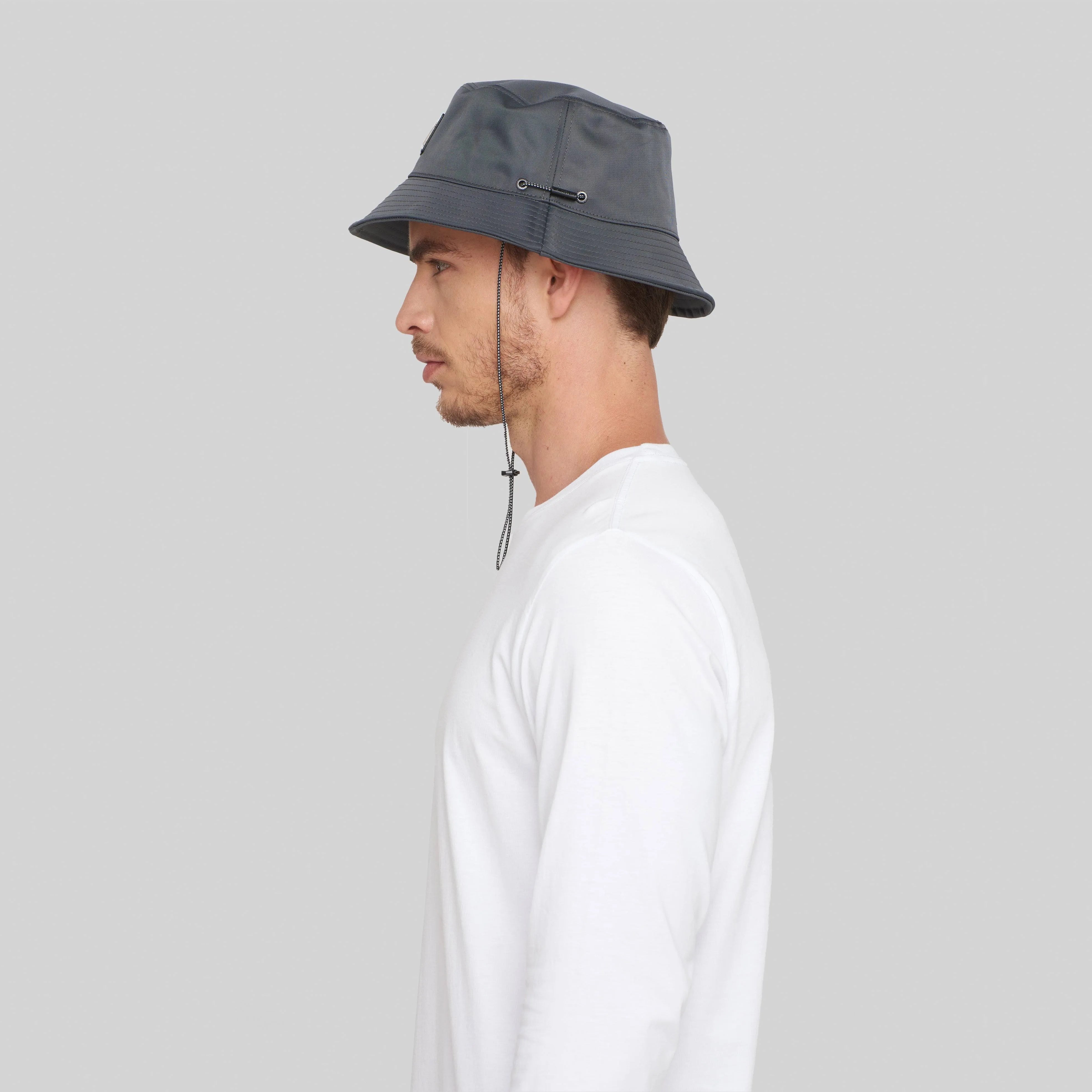 Hat Antigono unisex con silueta de gorro pescador, tira ajustable a la barbilla para un mejor agarre, ojaletes laterales que permiten la ventilación en el interior del gorro. Diseño con placa en cuero y logo metálico.