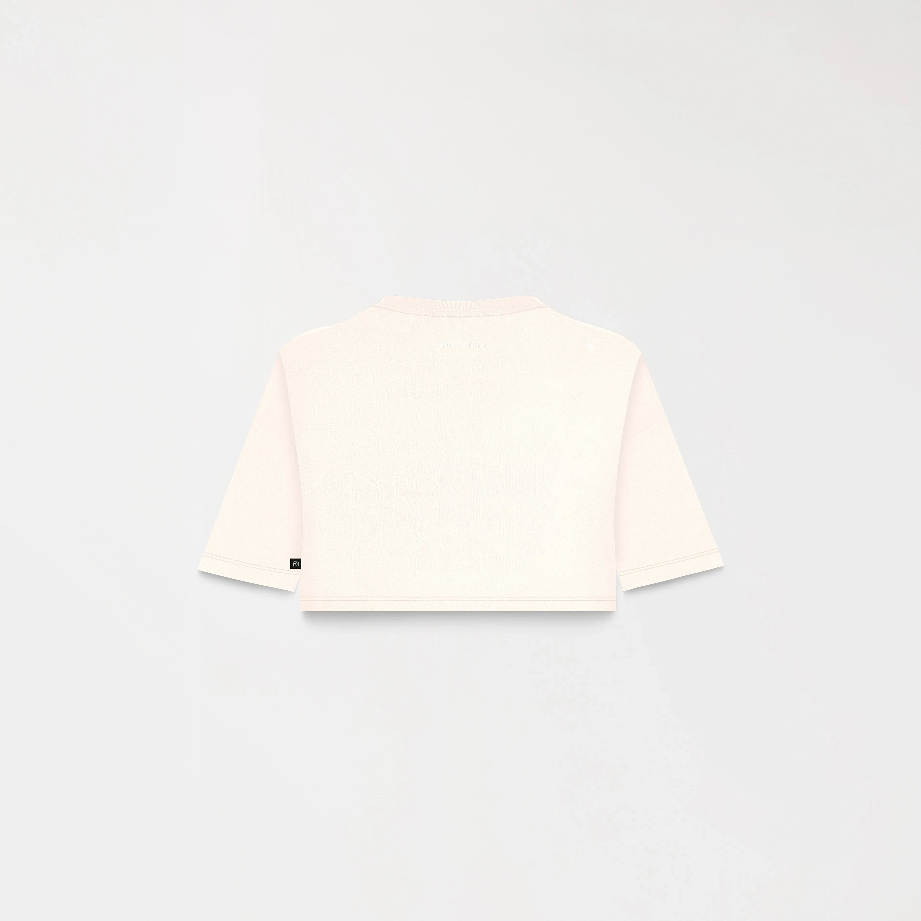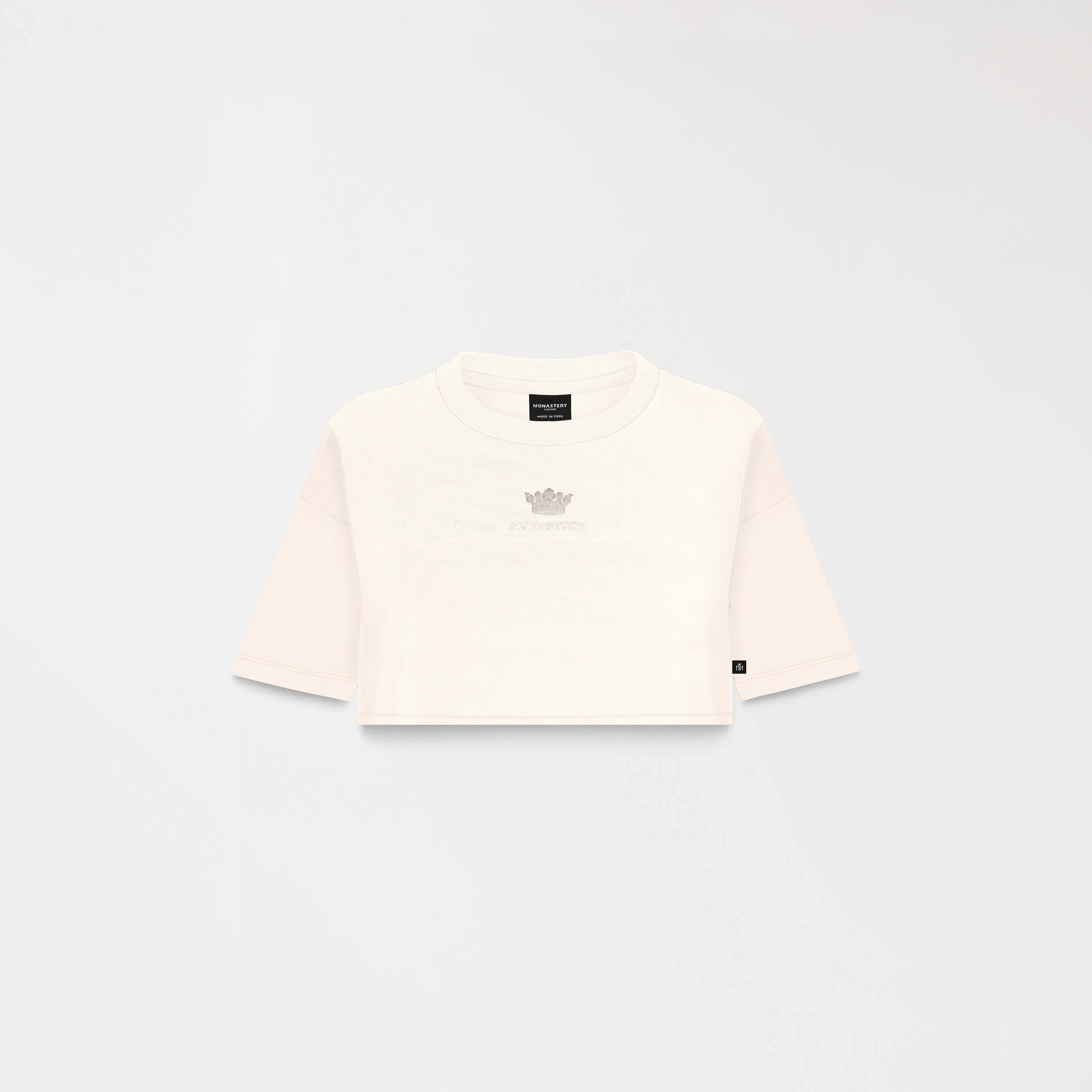 Crop top para mujer en algodón peruano exclusivo para Monastery, elaborada en silueta pequeña, Su corte holgado y corto lo hace ideal para un look fresco y casual. Con un color beige neutro y detalles en contraste, es una prenda versátil que se adapta a diversas ocasiones, Esta prenda presenta en frente un arte exclusivo para la colección The King y nuestro icónico logo Monastery en técnica flock, este crop top es ideal para quienes buscan un look cómodo y sofisticado gracias a su gran base textil y diseño.