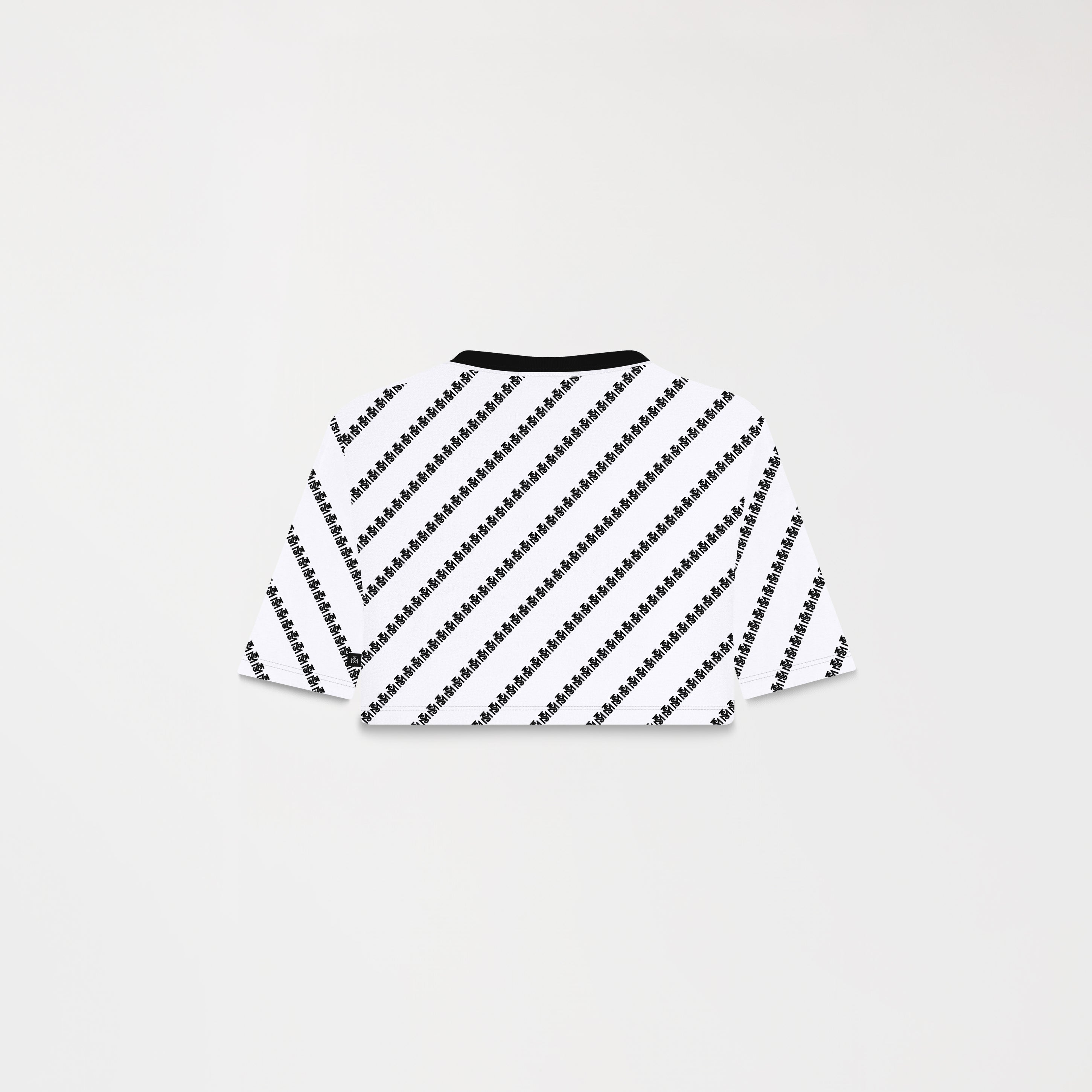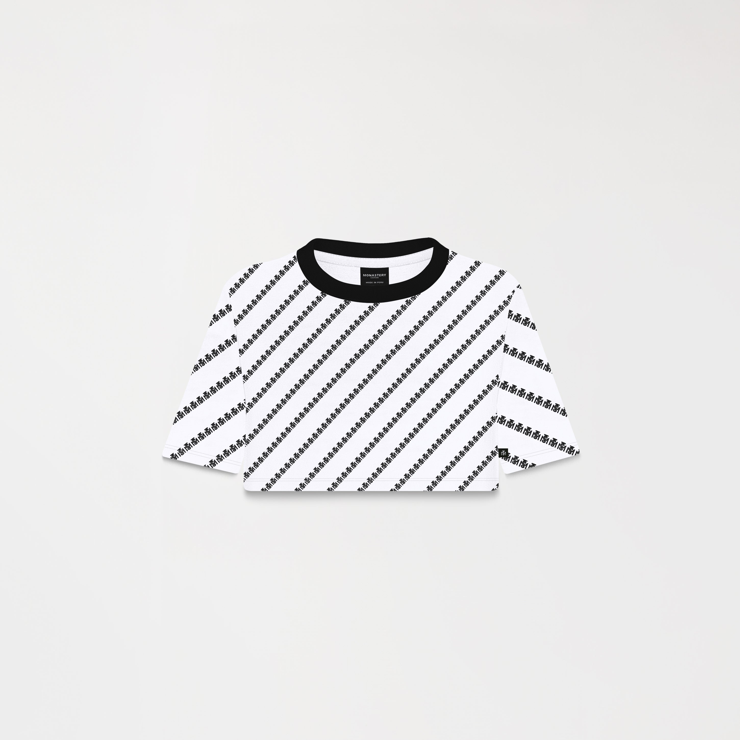 Britania es un crop top femenino confeccionado en algodón 100% exclusivo de Monastery. Su silueta pequeña se complementa con un fondeo total del logo TSM en repetición diagonal, creando un patrón dinámico y envolvente. El contraste de colores entre fondo y logotipo aporta fuerza visual, convirtiéndolo en una pieza ideal para quienes buscan estilo con personalidad.