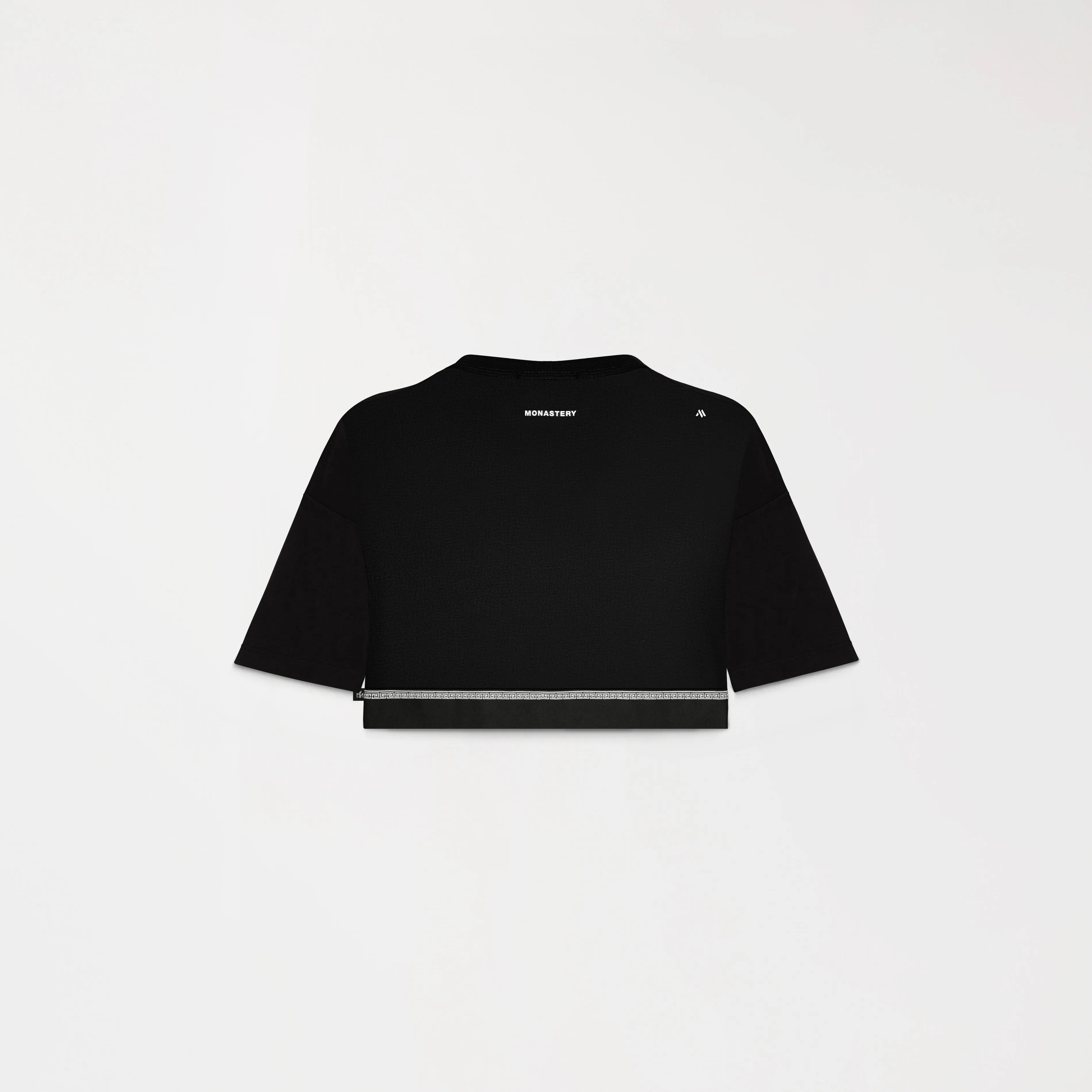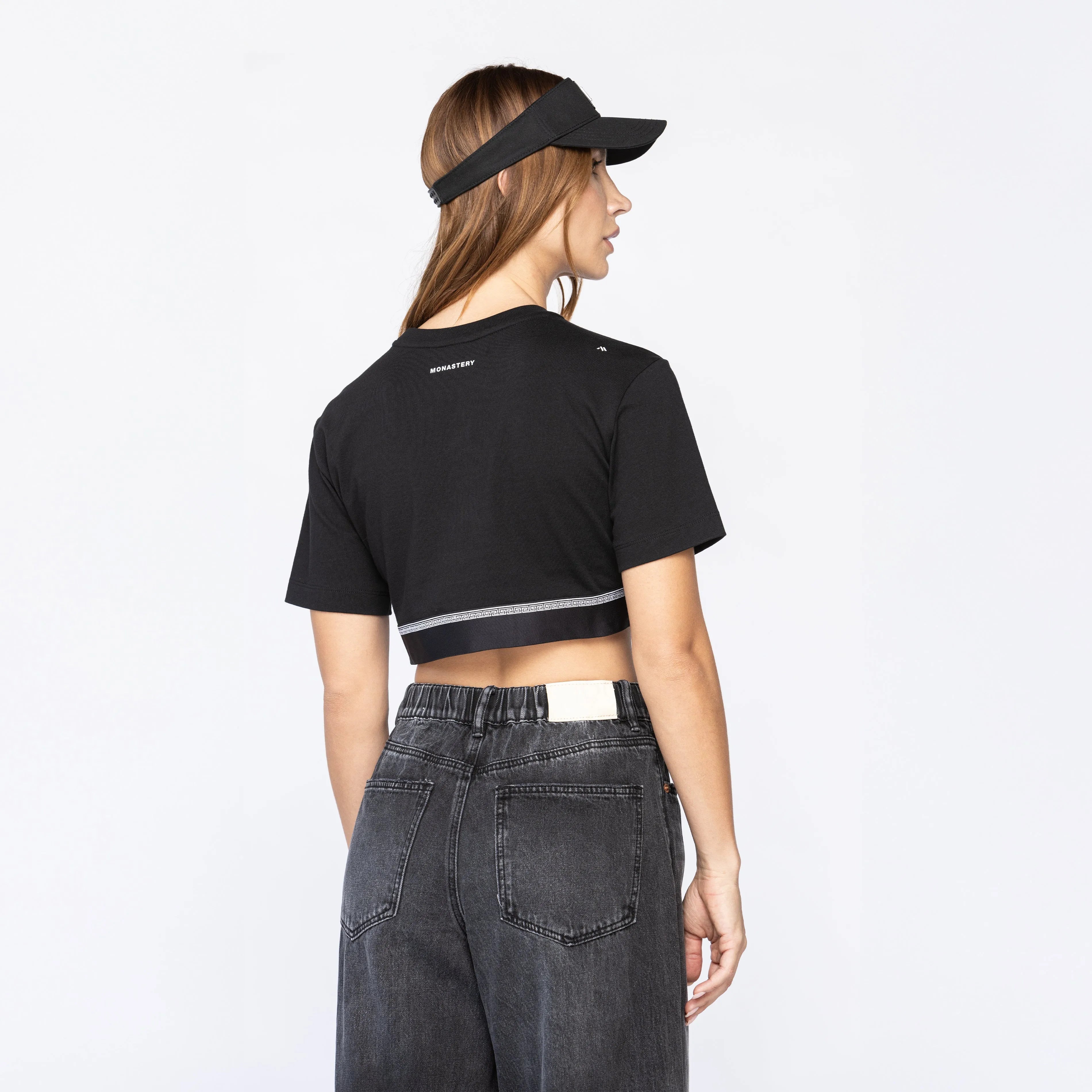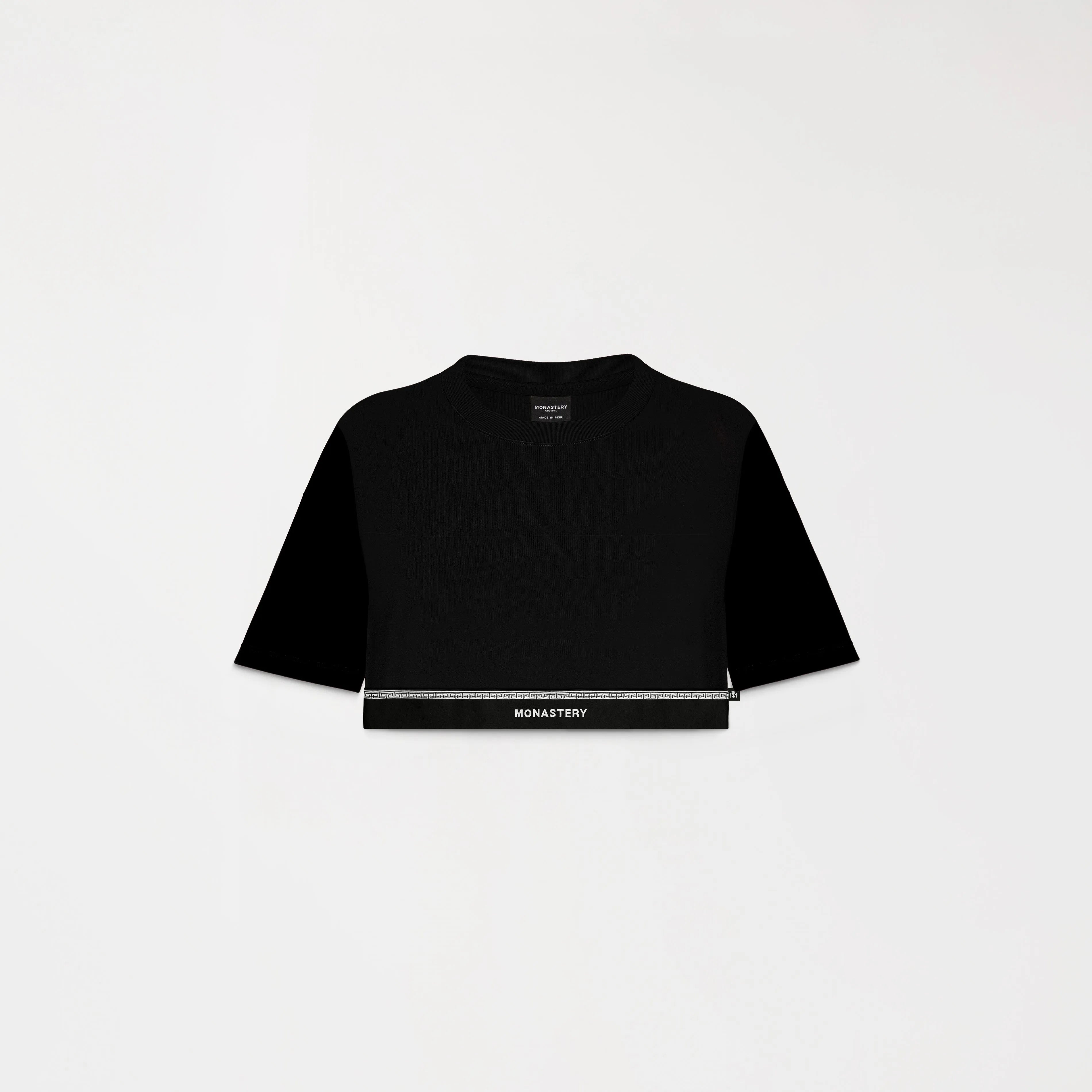 El crop top femenino Dorstan negro en algodón 100% exclusivo para Monastery, de silueta pequeña. Este diseño resalta por su elástico con estilo dórico de alta calidad destacando detalladamente nuestro logo Monastery en frente, cuenta con un estampado en alta densidad de nuestros icónicos logos insignia en espalda tono contraste, esta prenda tiene detalles que le dan un toque distinguido y moderno.