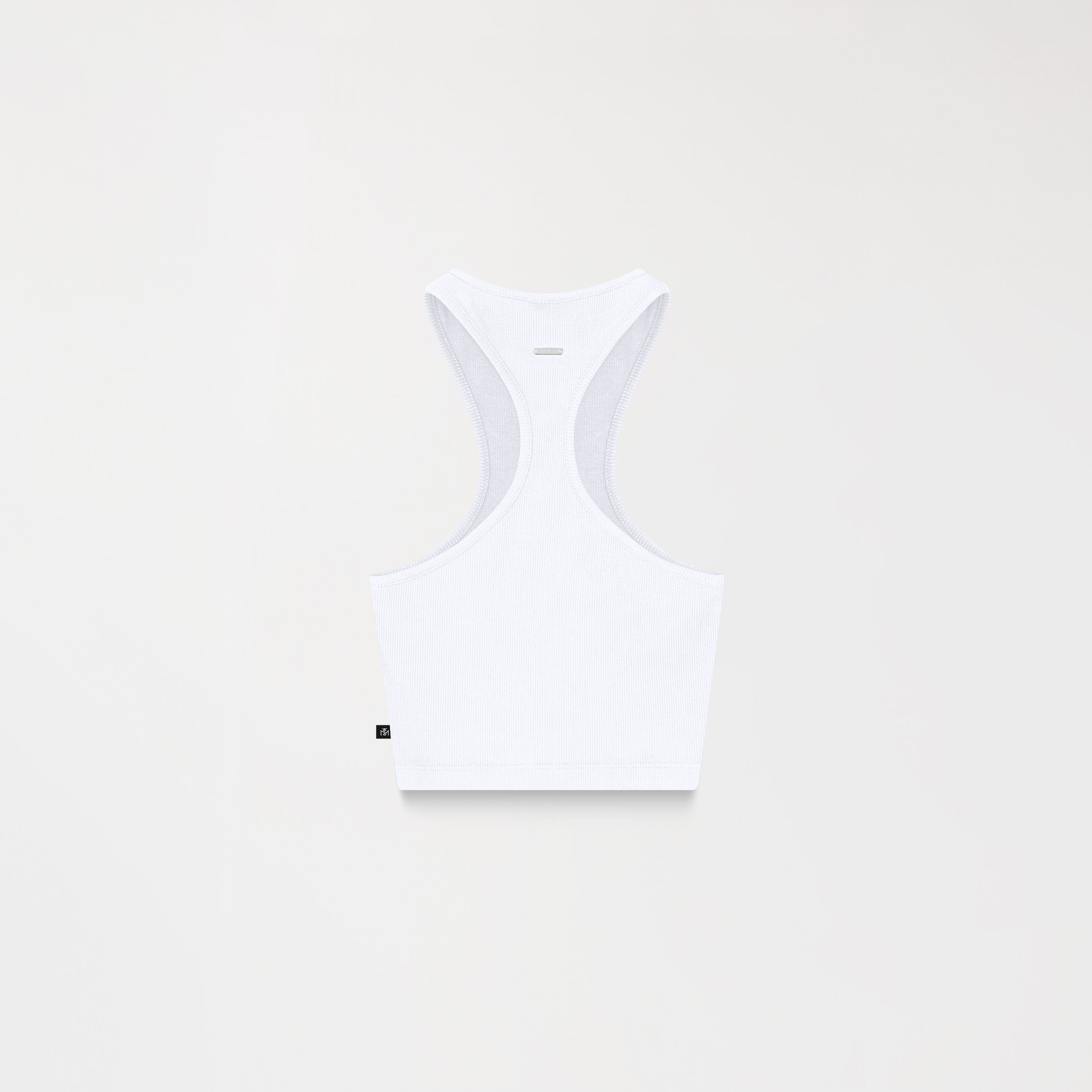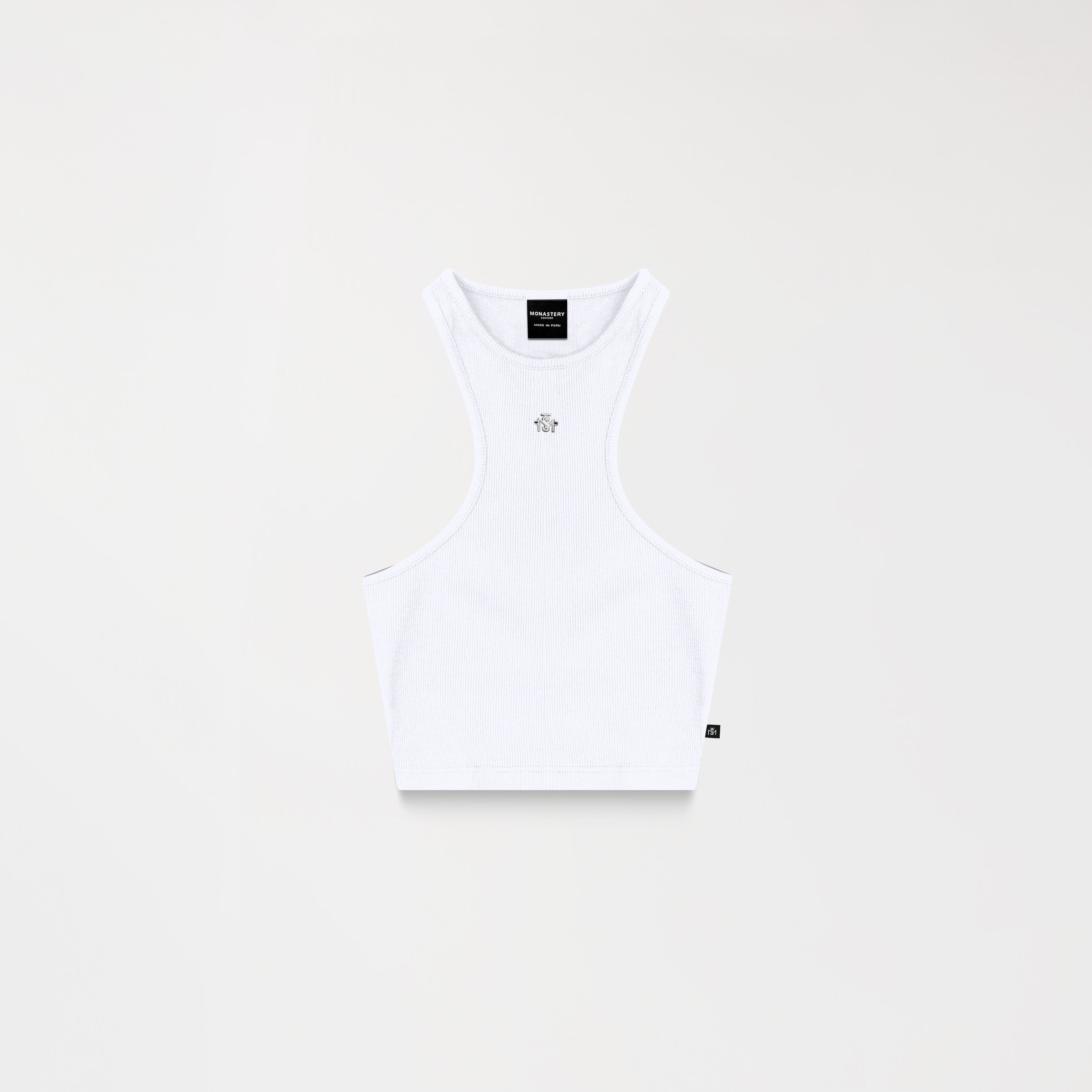Tank Top femenino elaborado en Rib exclusivo para Monastery, Con una silueta limpia y estructurada, Genna contiene un insumo metálico TSM en plata brillante funciona como acento visual principal en el frente, mientras que en la espalda cuenta con un innsumo contramarcado Monastery,los insumos en acabado plata especial han sido diseñados con exclusividad, resaltando el valor de cada detalle, los cuales refuerzan su identidad desde una estética sobria y precisa.