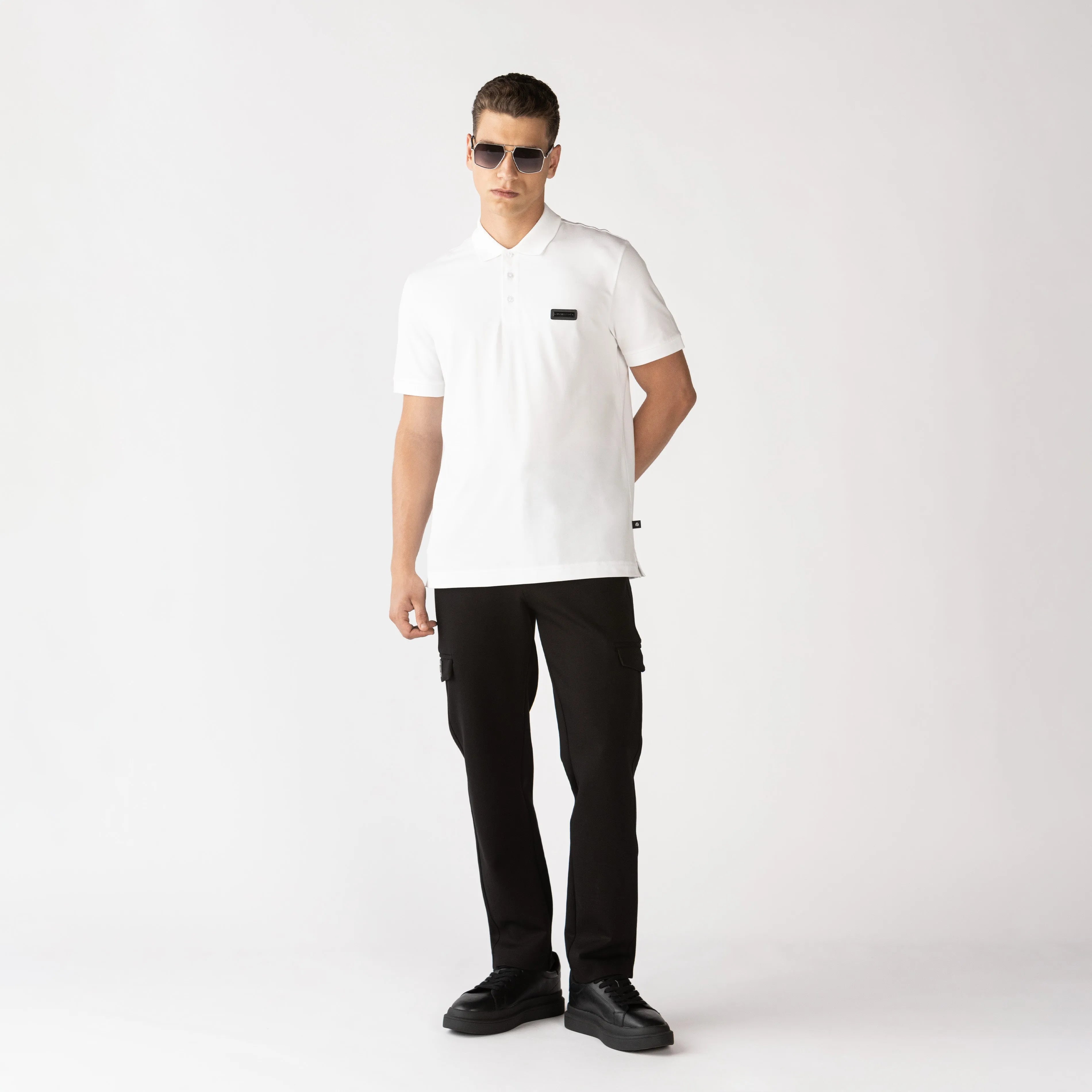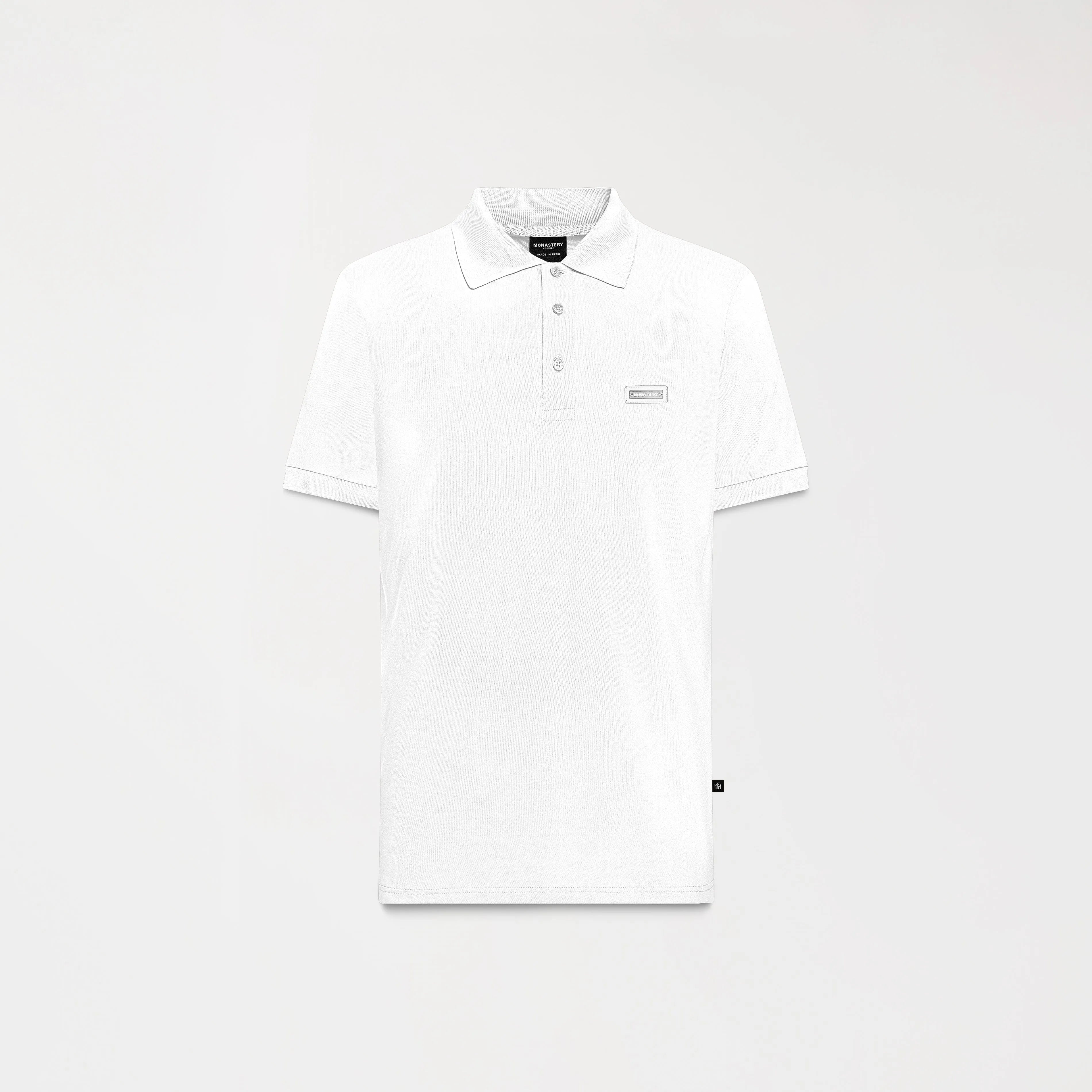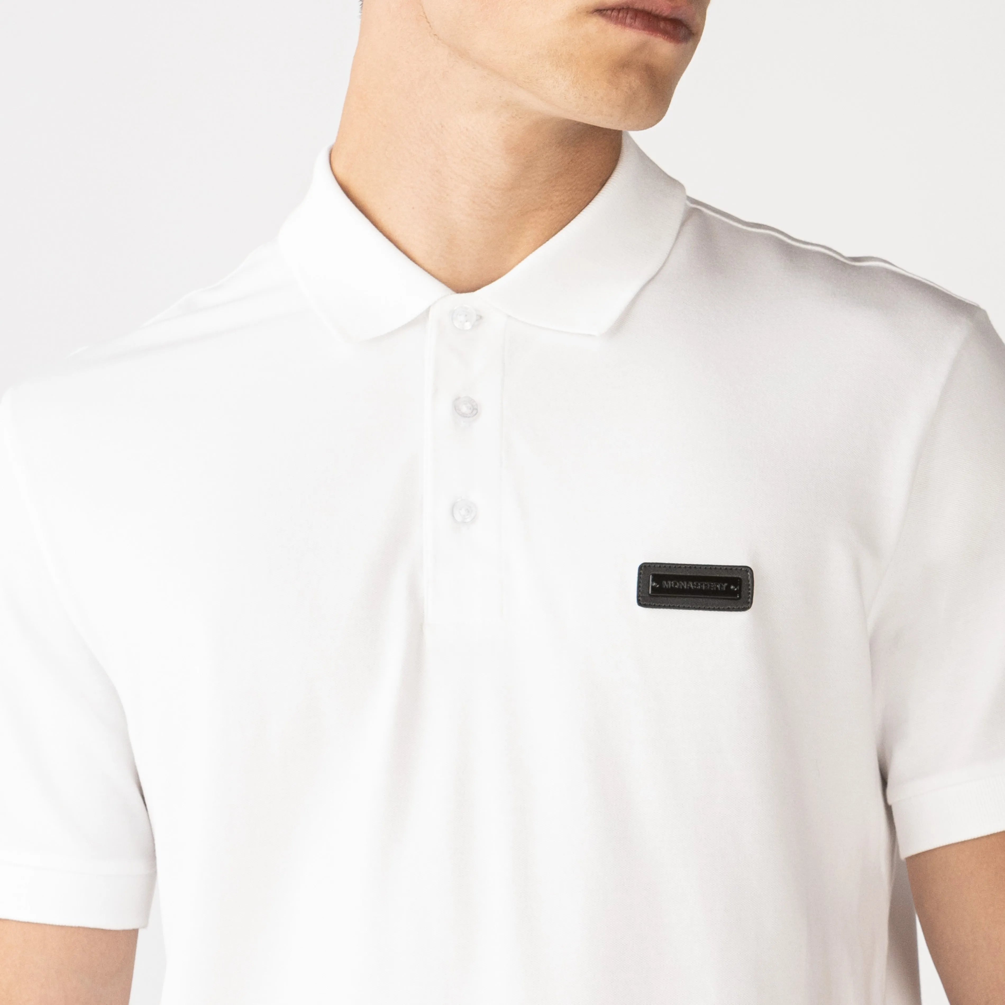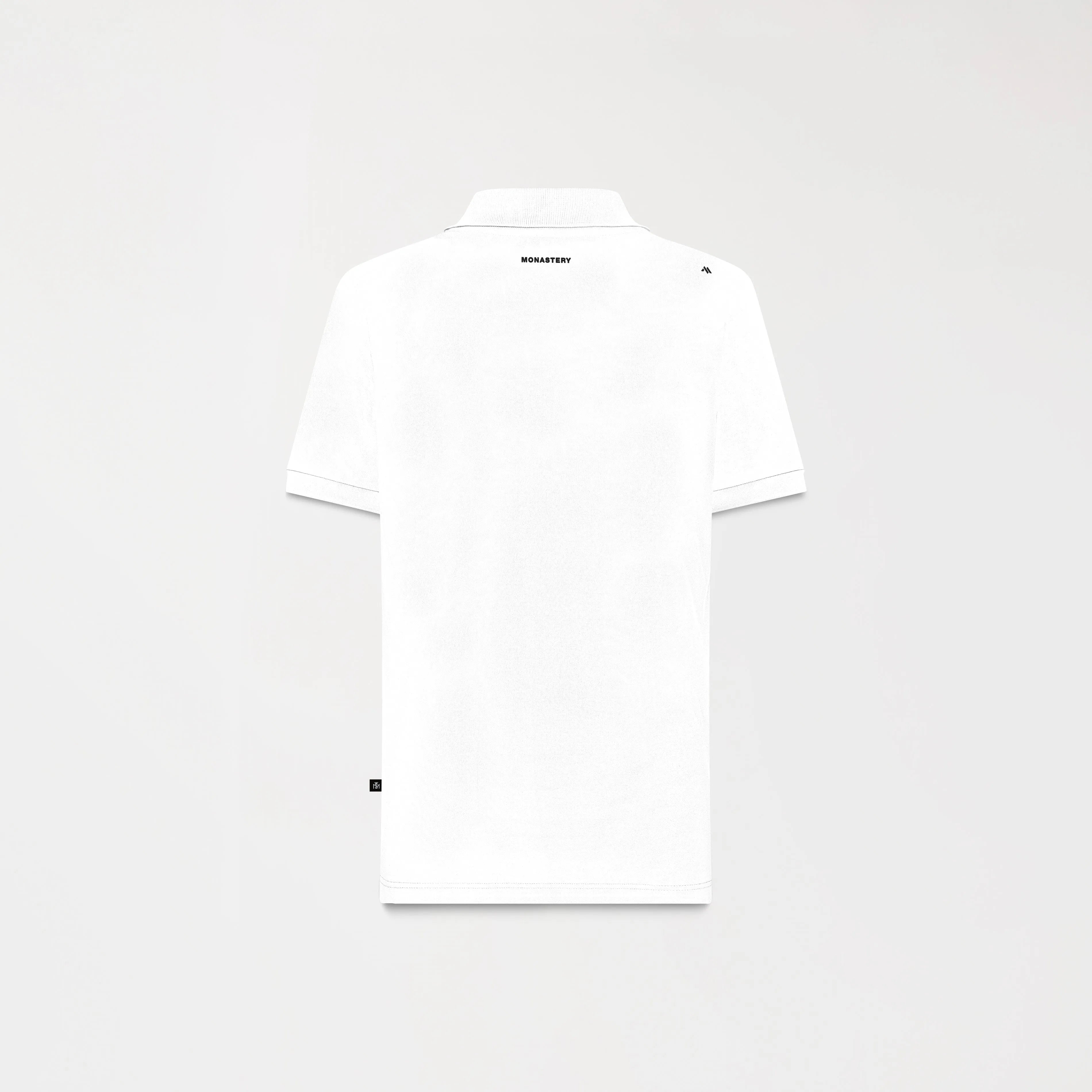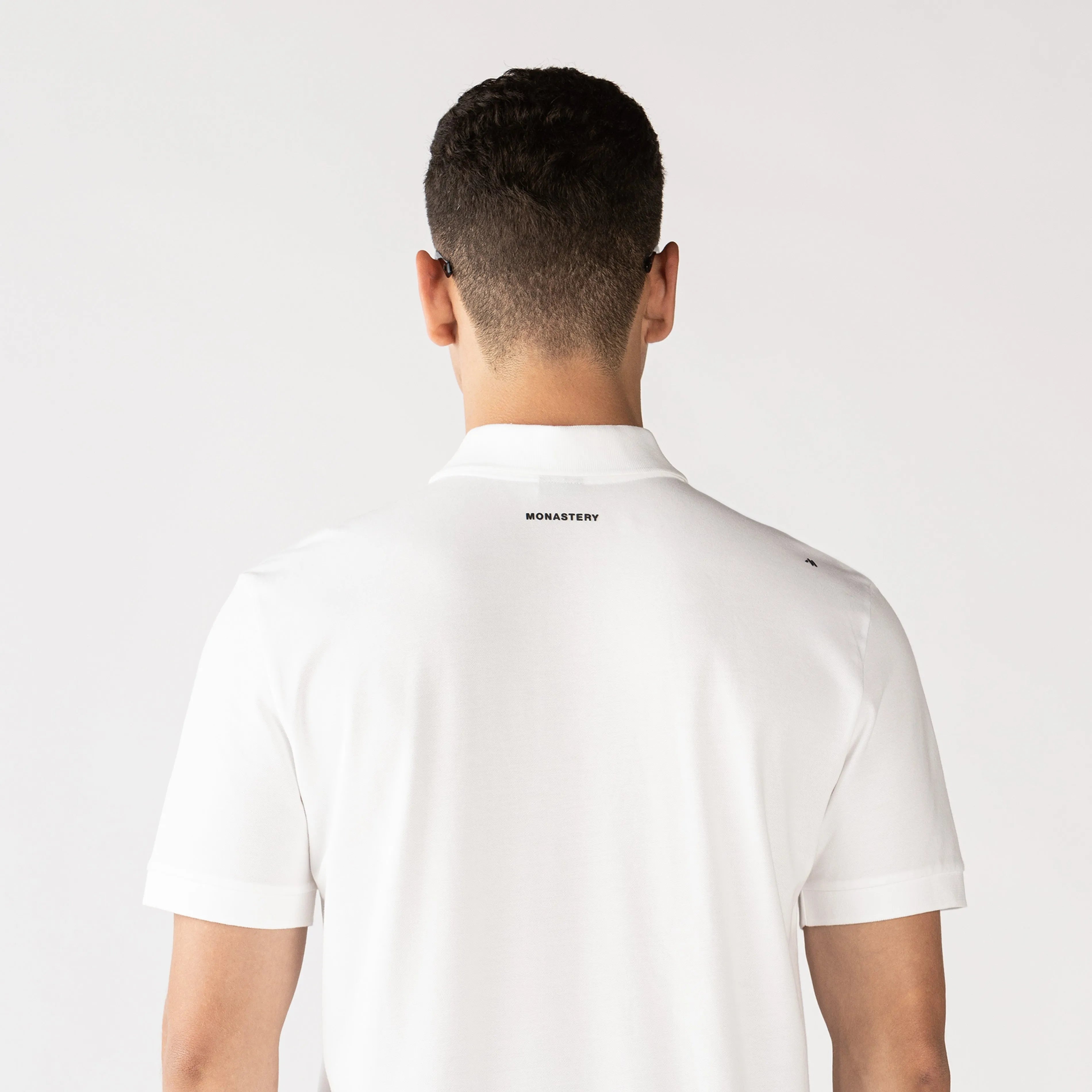 Playera tipo polo blanca para hombre, confeccionada en pique pima de alta calidad exclusivo para Monastery, Este elegante polo presenta un aplique distintivo ubicado en punto corazón, que añade un toque único y sofisticado. El diseño incluye cuello y puños tejidos que proporcionan un acabado pulido, mientras que los detalles en la parte posterior, están elaborados con alta densidad, destacan por su exclusividad. Ideal para quienes buscan un estilo moderno y refinado.