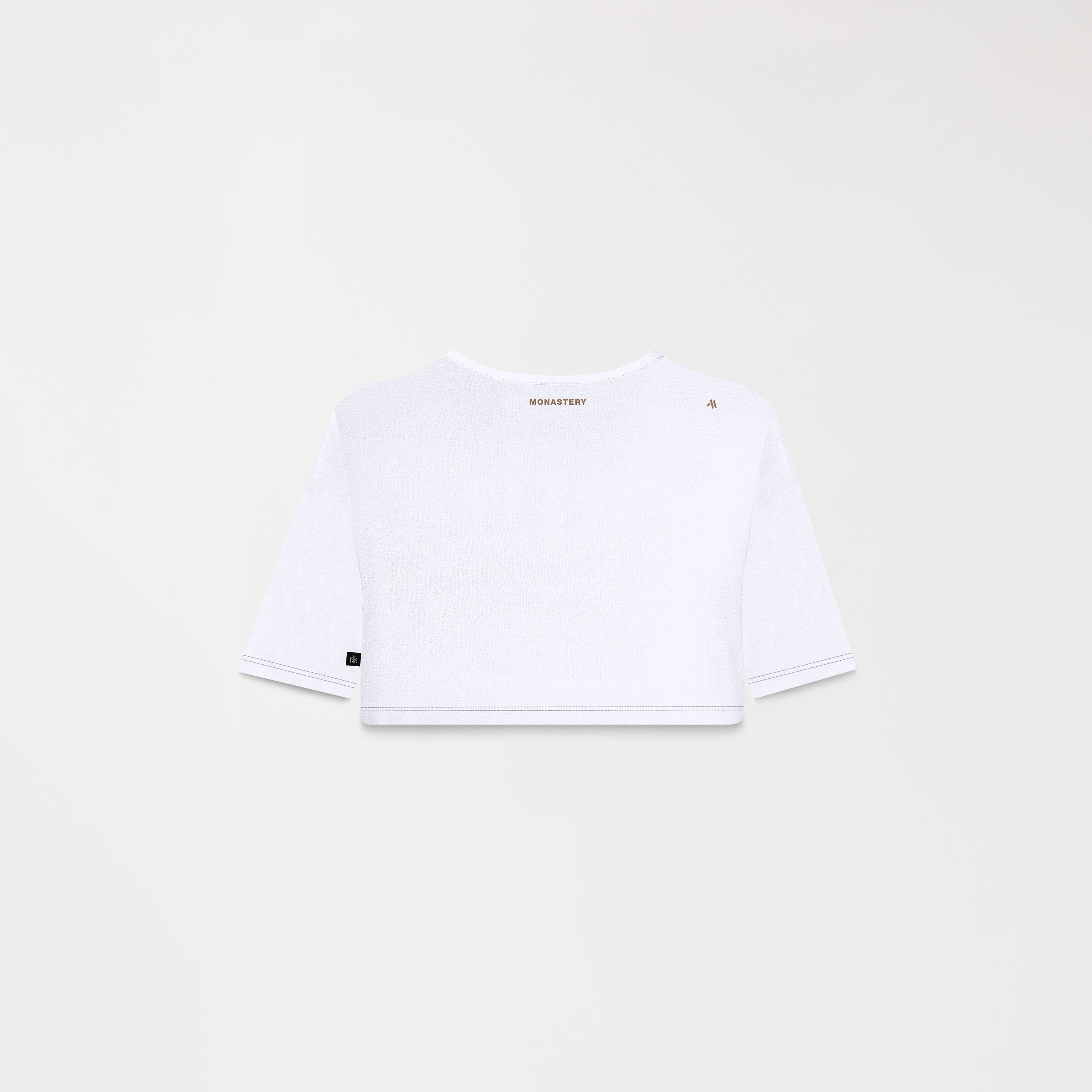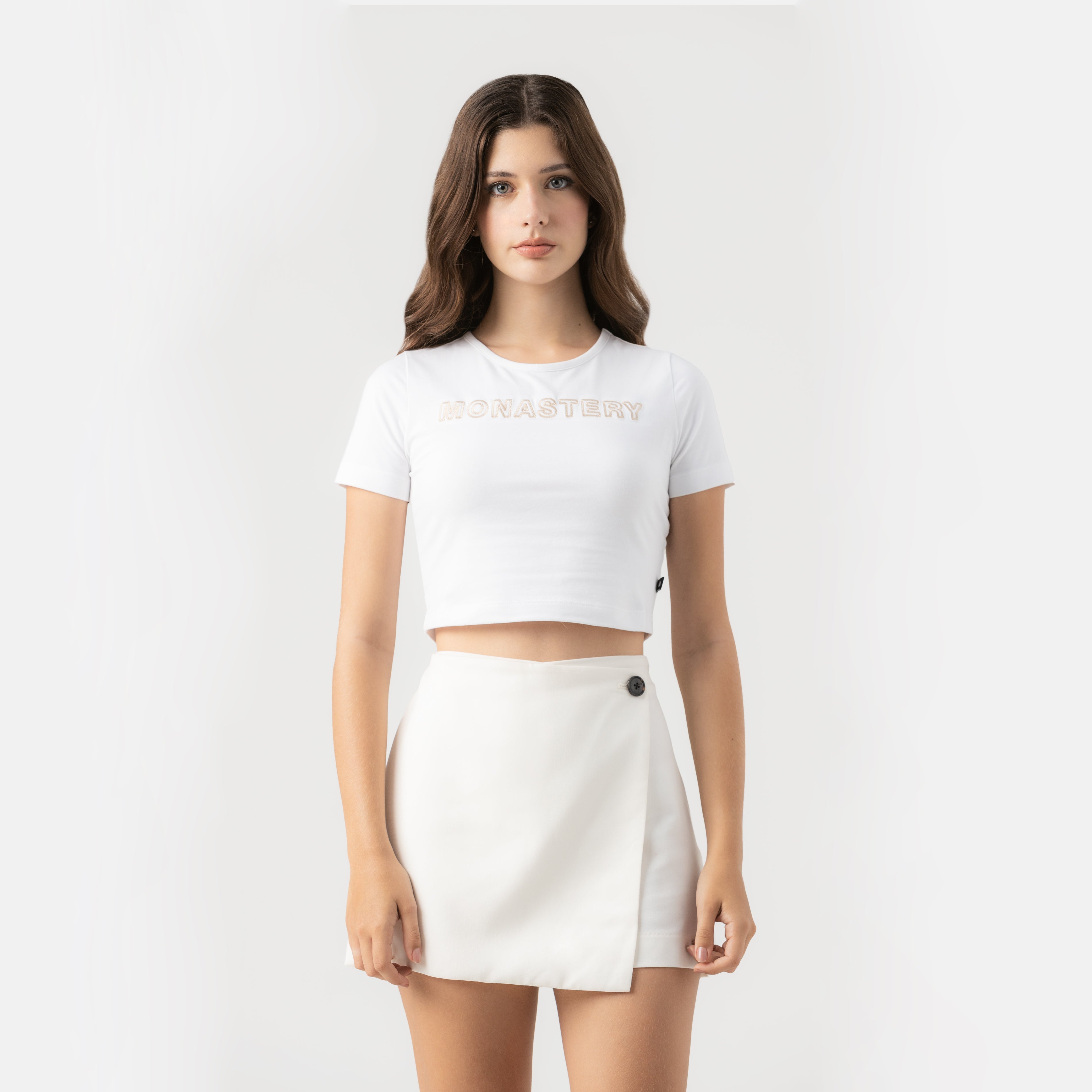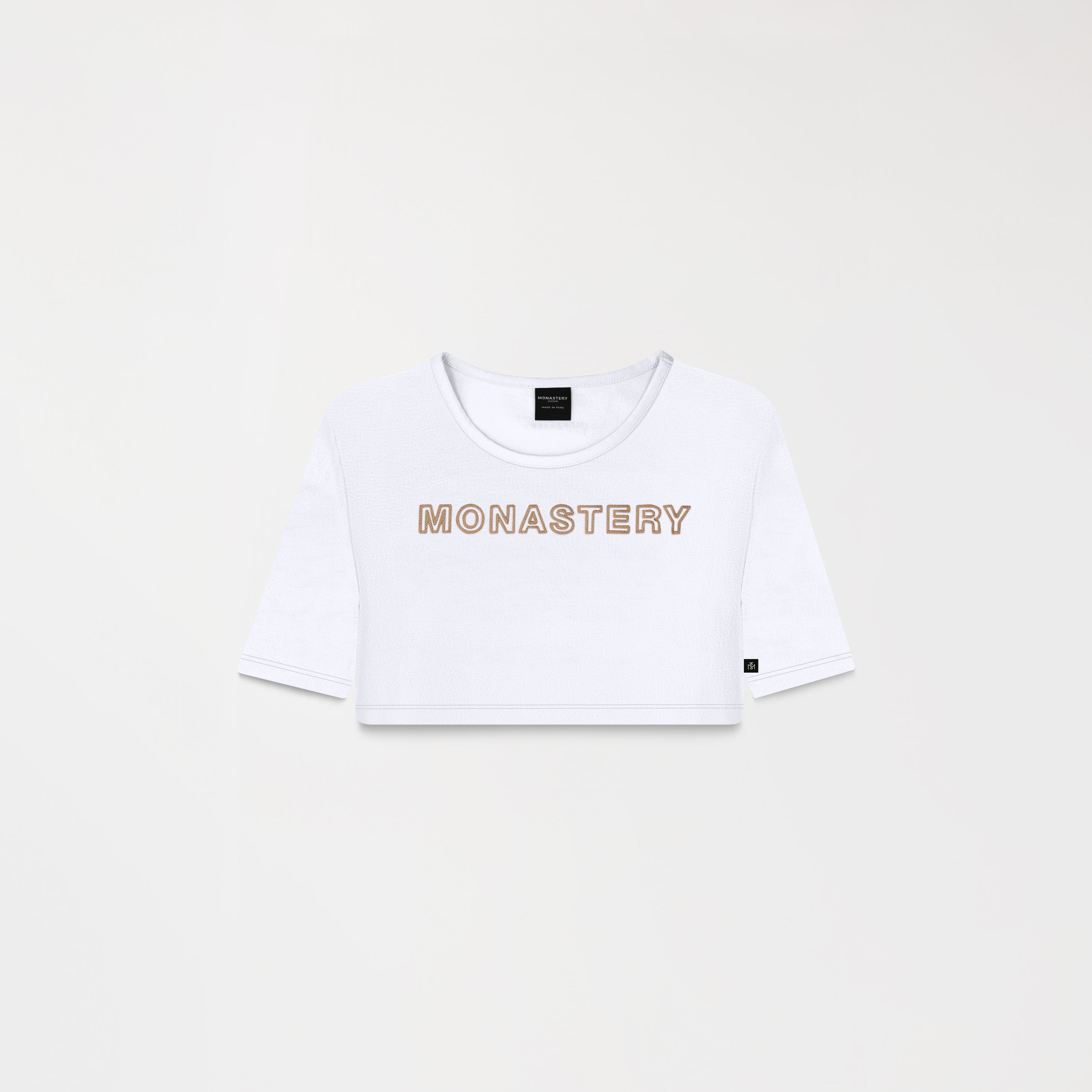 Kaia es un crop top femenino de silueta corta con cuello en sesgo, diseñado para realzar la figura. Confeccionado en una base textil fresca y ajustada, combina comodidad con sofisticación. El frente destaca con el logo Monastery en técnica de bordado con efecto cuerda, mientras que la espalda incorpora los logos insignia en estampado plano, reforzando su carácter distintivo. Una prenda versátil que aporta identidad y estilo en cada ocasión.