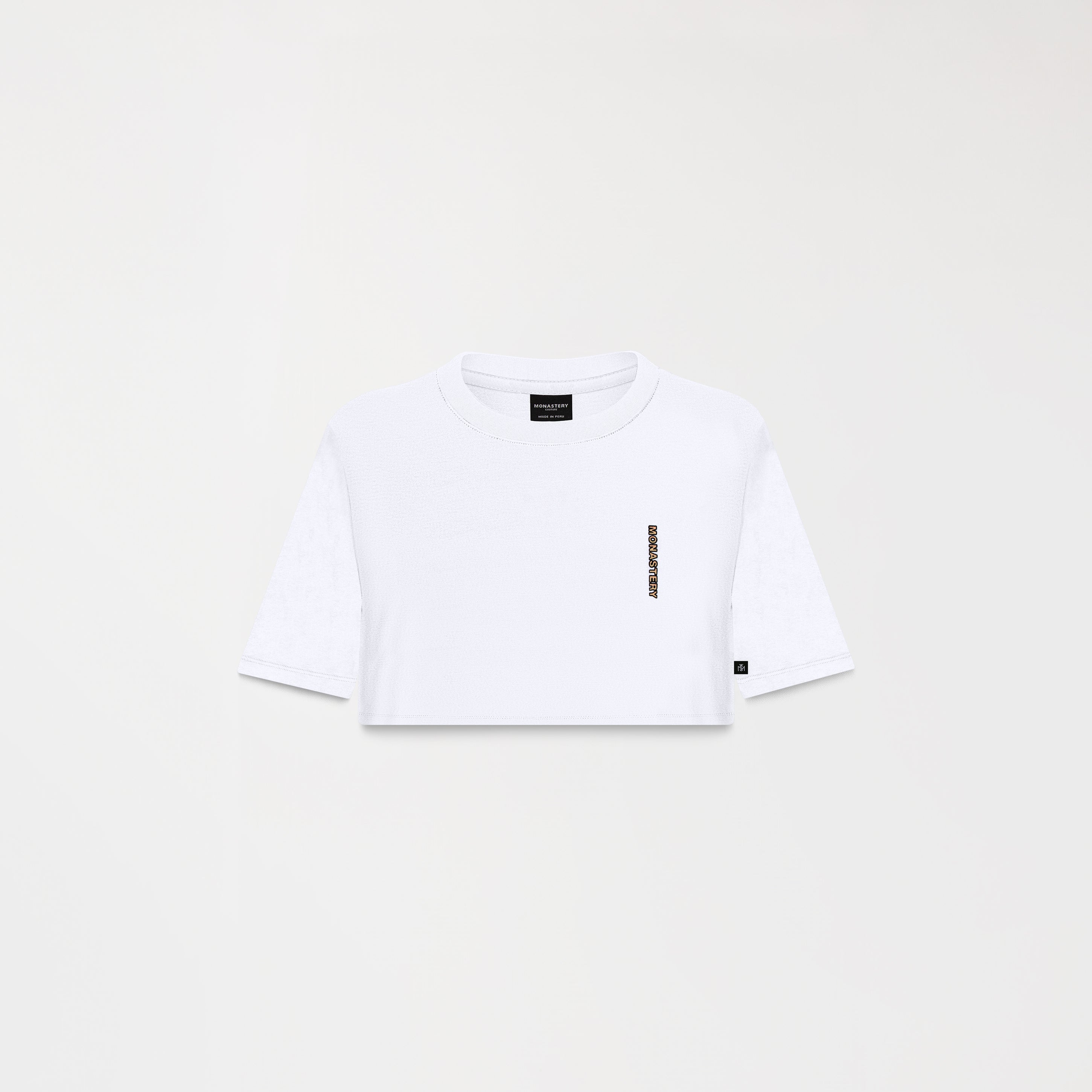 Crop top femenino en algodón 100% exclusivo para Monastery, silueta pequeña. Nekane presenta un diseño frontal en degradé que aporta profundidad visual y movimiento, acompañado de técnica flock eleva el acabado del estampado, la espalda cuenta con logos insignia en estampado plano, obteniendo una prenda perfecta para complementar tu vestuario.