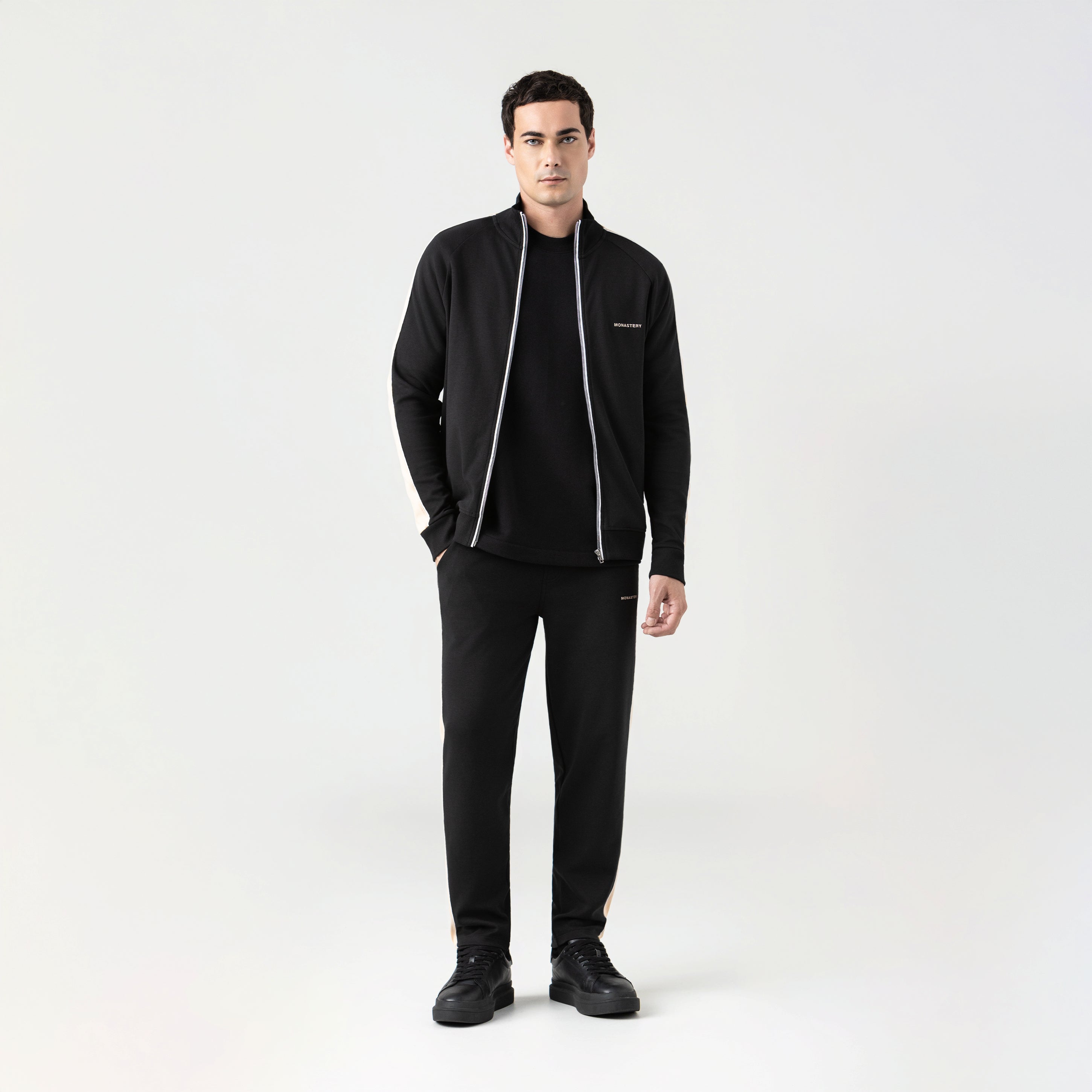 La chaqueta incorpora bolsillos con cremallera, bordado del logo Monastery y un estampado en alta densidad en la espalda que aporta carácter sutil pero inconfundible. Los vivos en contraste realzan su estructura con precisión.